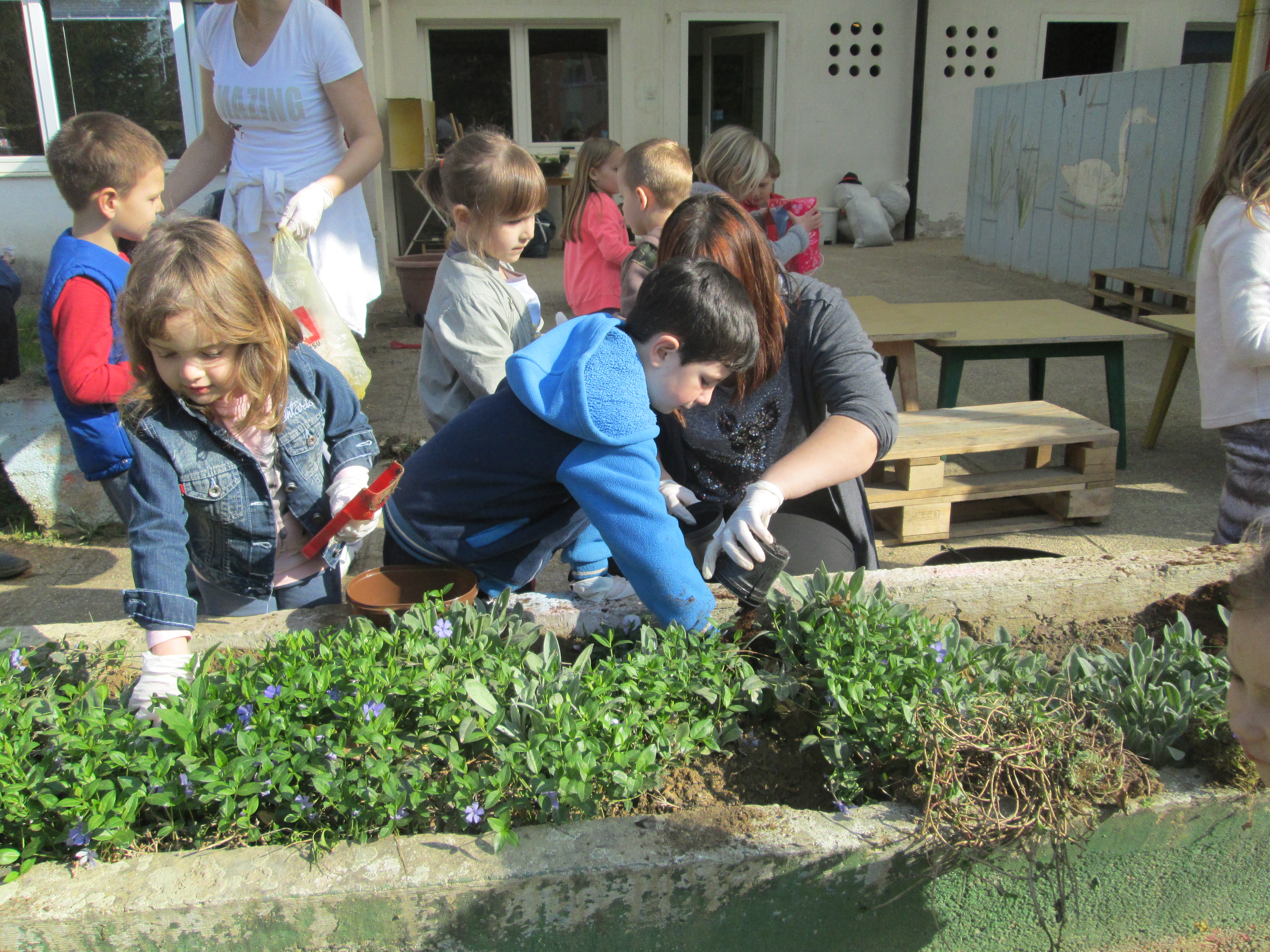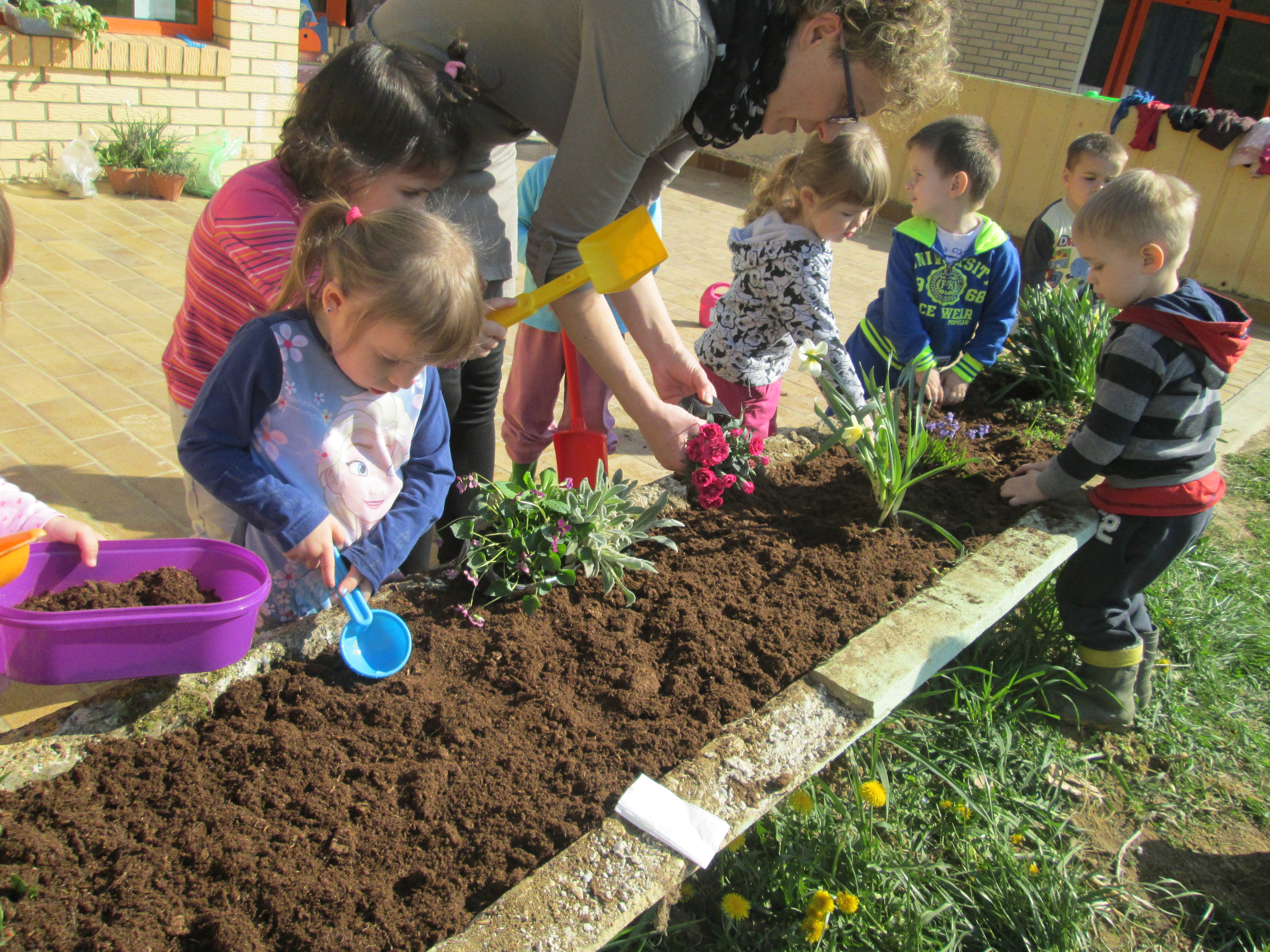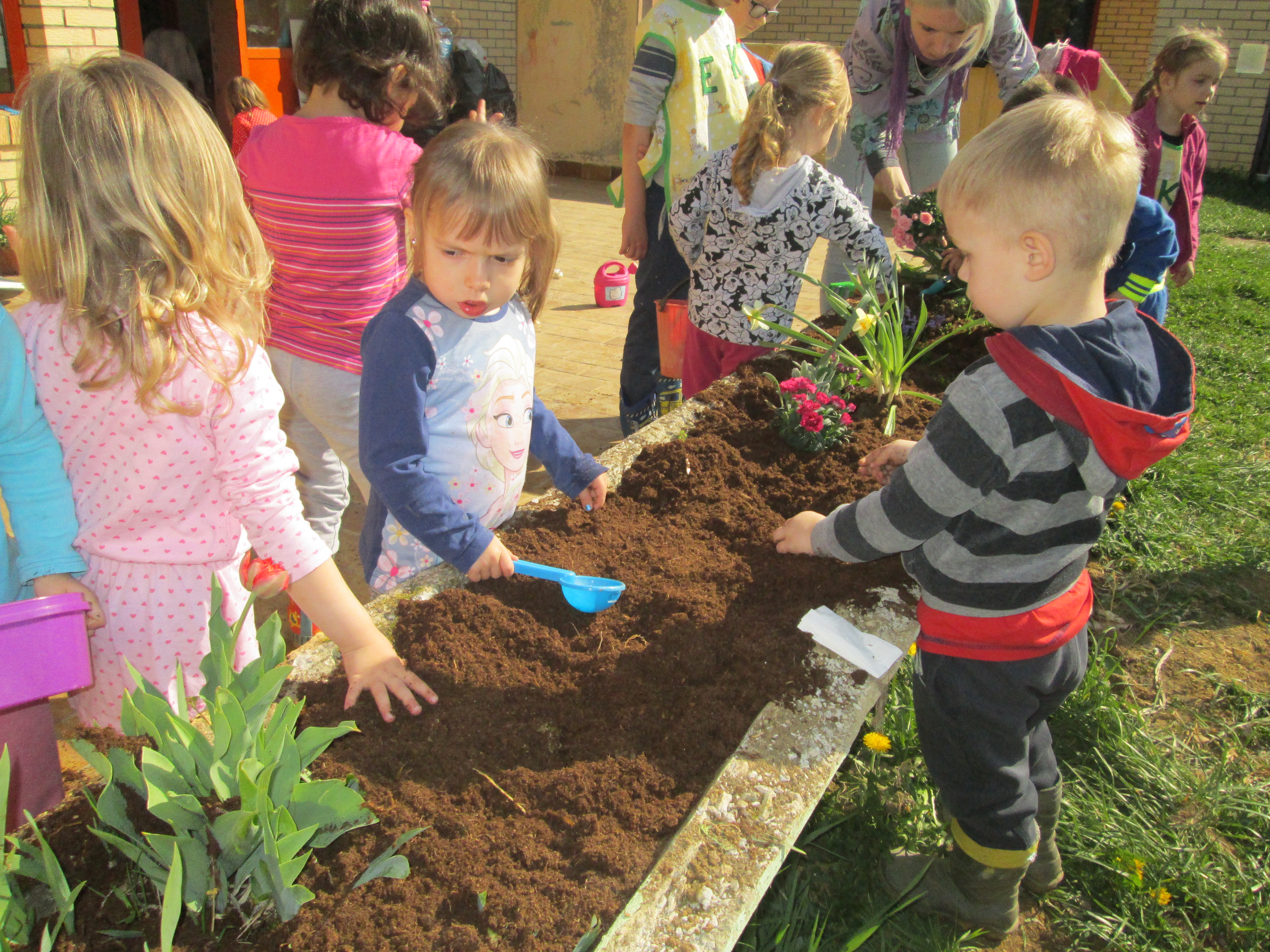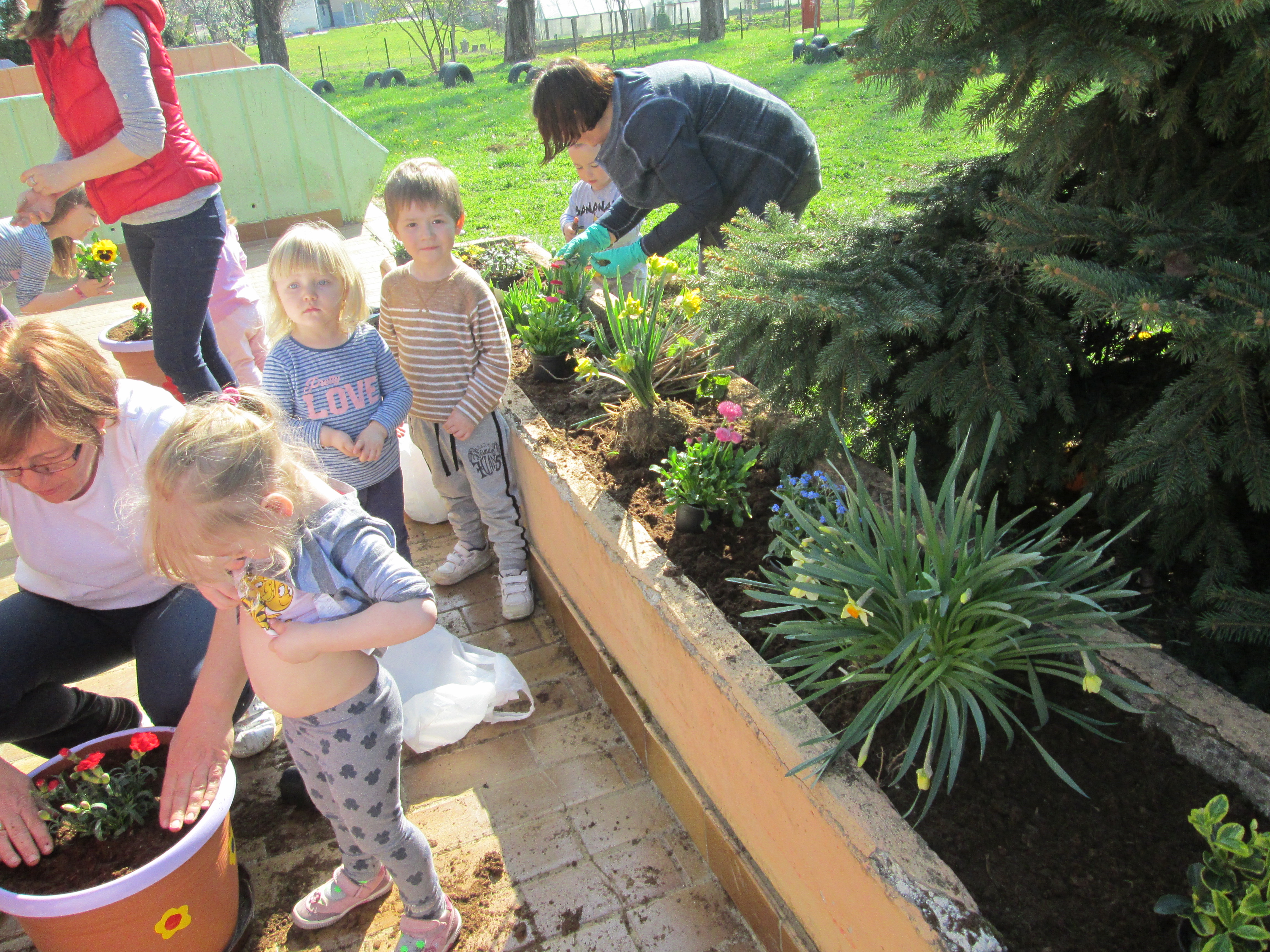 U petak, 31.03.2017. u Dječjem vrtiću Križevci održan je projektni dan. Od jutra je bilo živo i aktivno na našim terasama gdje su vrijedne ruke djece, odgojiteljica, roditelja i baka uređivale cvjetnjake. Sadnice smo prikupili u suradnji s roditeljima i Komunalnom poduzećem Križevci. Osim sadnica cvijeća zasađene su i sadnice drveća u suradnji sa Šumarijom Križevci. Eko patrola je budnim okom pratila odvijaju li se navedene aktivnosti pravilnim redoslijedom jer kako su sami rekli – trebamo pripremiti zemlju, iskopati rupu, staviti biljku, pritisnuti zemljom i zaliti. Da bi naše biljke rasle moramo im uz dobru zemlju, svjetlost i toplinu osigurati i dovoljno vlage pa će svaka odgojna skupina voditi brigu o svom malom cvjetnjaku i redovito ga zalijevati.